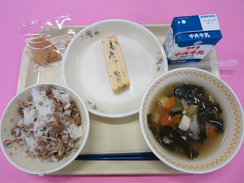 かきまわし(ご飯)、牛乳、愛知の厚焼き卵、はちはい汁、きらずあげ