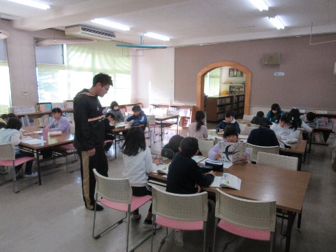 1時間目は国語の授業でした。図書室で「野原に集まる」の学習で、詩を作りました。