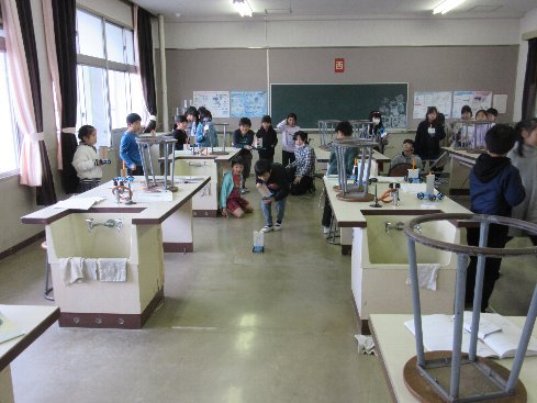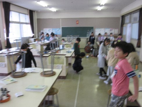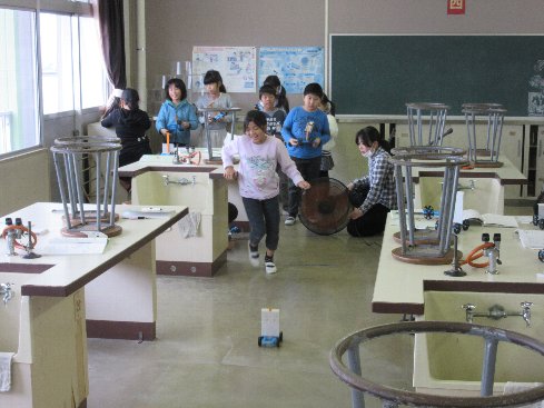 1時間目は理科の授業でした。風の働きを確認するために、扇風機の風を使って風力自動車がどれだけ進むか確かめました。