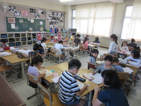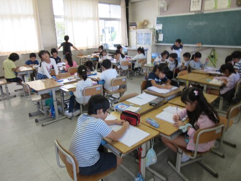 5月30日(水)3時間目は算数の授業でした。章末問題に取り組みました。早くできた子が「小さい先生」になって、理解がまだの子のお手伝いをしていました。
