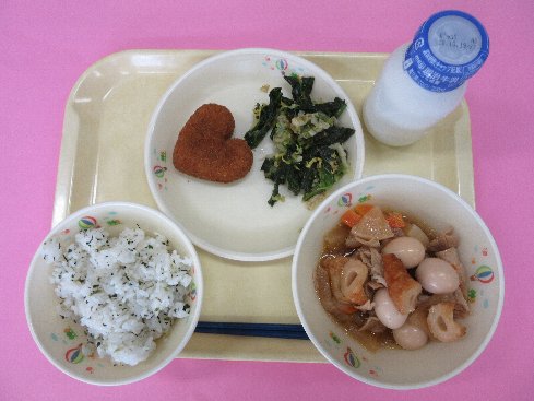 ご飯、牛乳、竹輪の磯辺揚げ、ほうれん草和え、のっぺい汁、乾燥小魚