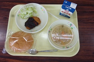 サンドイッチバンズパン、牛乳、みそカツ、コンソメスープ、茹でキャベツ