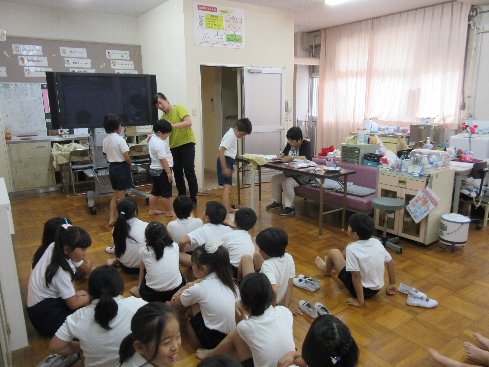 1時間目に発育測定をしました。はじめに、熱中症についてのお話を聞きました。