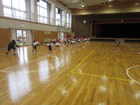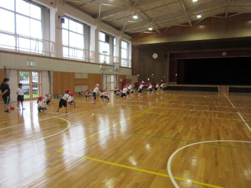 3時間目は体育の授業でした。準備運動のあと、紙飛行機を使って、投げ方の練習をしました。