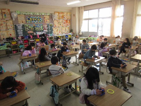 3時間目は算数の授業でした。算数ボックスの時計を使って、時計の読み方について学習しました。