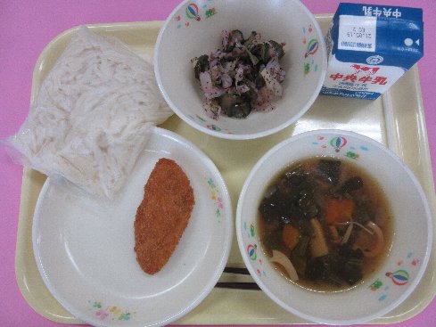 山菜うどん(白玉うどん)、牛乳、鰹フライ、紫蘇和え