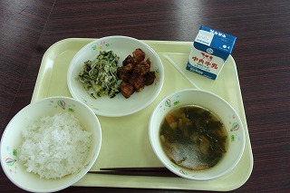 ご飯、牛乳、白身魚のみそがらめ、いそかあえ、よしの汁