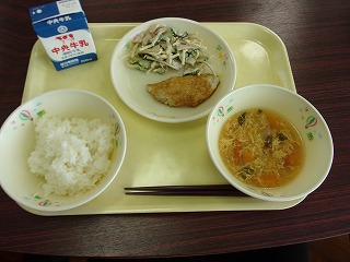 ご飯、牛乳、アジのレモンソース、ゴボウサラダ、トマトと卵のふんわり汁