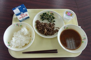 ご飯、牛乳、ぎゅうにくのしぐれに、ほうれん草ともやしのおひたし