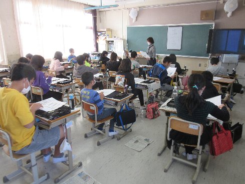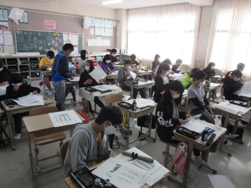 4時間目は書写の授業でした。「五月雨を集めてはやし最上川」を半紙に散らして書きました。