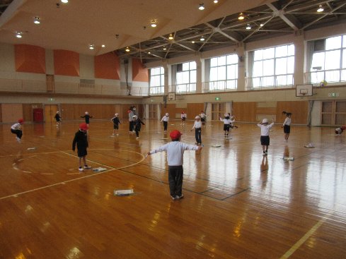 5月7日(月)今日から運動会練習が始まると言うことで、着替えに時間のかかる1・2年生は朝礼前に着替えました。朝礼の後、そのまま体育館で1・2年合同の朝の会を行いました。