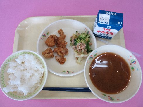 ご飯、牛乳、鶏肉の揚げ照り、花野菜サラダ、じゃがいもの味噌汁