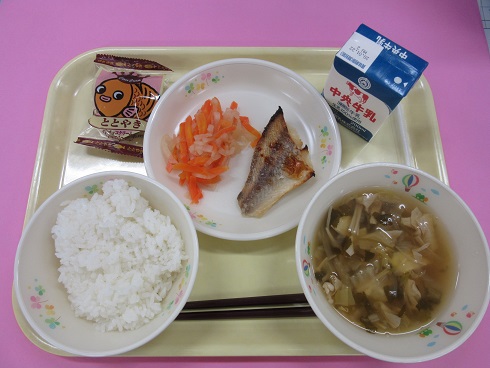 ご飯、牛乳、赤魚の麹焼き、紅白なます、湯葉のすまし汁、ミニチョコ鯛焼き