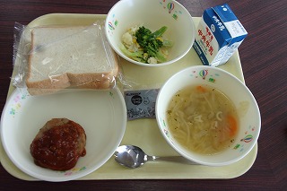 レンコンハンバーグ、花野菜サラダ、アルファベットスープ