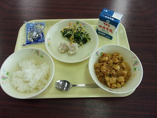 ご飯、牛乳、麻婆豆腐、しゅうまい、なむる、乾燥小魚