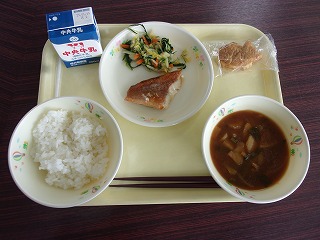 ご飯、牛乳、赤魚の照り焼き、水菜のあえもの