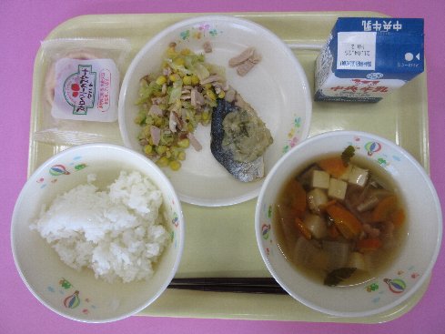 ご飯、牛乳、鰆の葱味噌かけ、春キャベツの和え物、桜のすまし汁、苺タルト