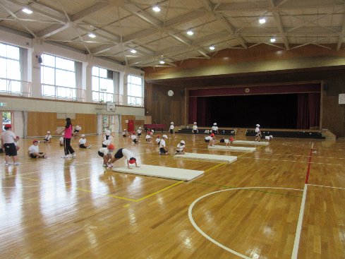 3時間目は体育の授業でした。運動場で授業を始めたのですが、雨が降ってきてしまい、体育館へ移動。マット運動をしました。