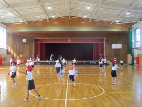トスの練習として、小さなボールを高く上げて取る練習に取り組んでいました。