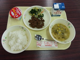 ご飯、牛乳、ビビンバ(肉炒め)(ナムル)