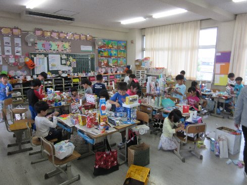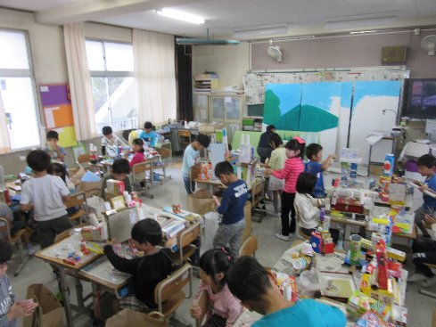 2時間目は図画工作の授業でした。「はこでつくったよ」で、家で用意した様々な箱を使って、自由に作品を作っていました。