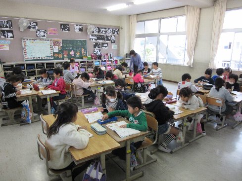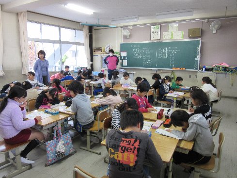 5月30日(水)3時間目は算数の授業でした。章末問題に取り組みました。早くできた子が「小さい先生」になって、理解がまだの子のお手伝いをしていました。