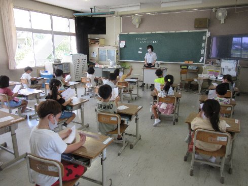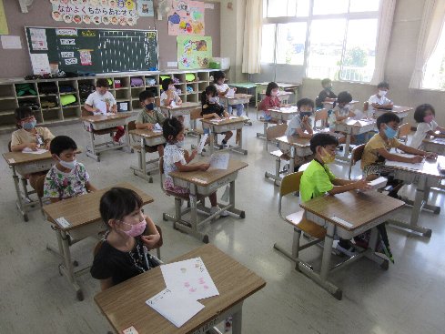 3時間目は算数の授業でした。手作りの絵本を見て問題を解きあいました。