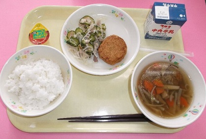 ご飯、牛乳、愛知の野菜入りメンチカツ、春雨サラダ、芋のこ汁、一口ゼリー(ピーチ)