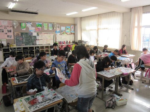 3時間目は図画工作の授業でした。「物語から広がる世界」をステンシルの技法で描きました。