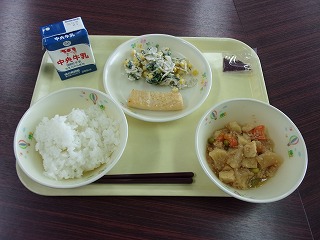 ご飯、牛乳、いかのあまからやき、大根のそぼろに