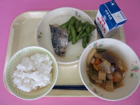 ご飯、牛乳、鰆の西京焼き、五目旨煮、枝豆