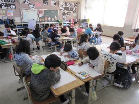 5月22日(火)4時間目は図工の授業でした。「絵の具やクレパスを使って、思い出の絵を描こう」ということで、運動会の思い出を絵に描きました。