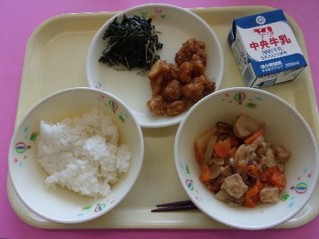 ご飯、牛乳、揚げ鶏のレモンソース、おおひら、磯香和え