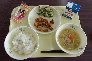 ご飯、牛乳、レンコンのあまから上げ、バンバンジー、
