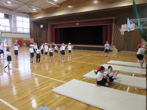 1時間目は体育の授業でした。マットと肋木を使って、体づくりをしました。