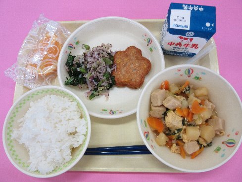 ご飯、牛乳、花形半平、親子煮、紫蘇和え、オレンジ