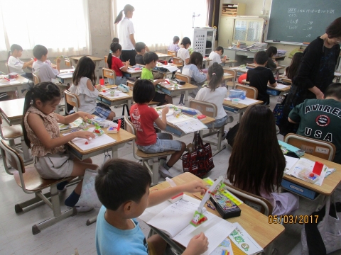 教科書の付録のてんびんを使って、身の回りのものの重さを量っていました。