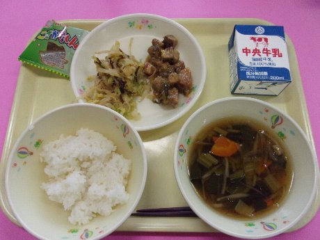 ご飯、牛乳、豚の角煮、昆布和え、具沢山汁、乾燥小魚