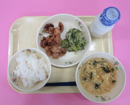 ご飯、牛乳、蛸の唐揚げ、和風サラダ、トマトと玉子のふんわり汁