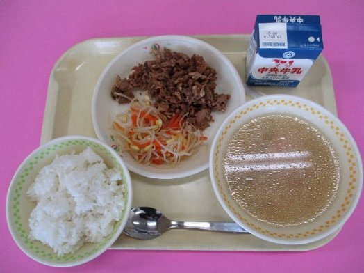 ご飯、牛乳、ビビンバ(肉炒め)(ナムル)、中華スープ