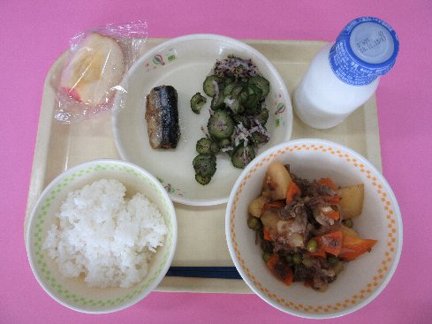 ご飯、牛乳、秋刀魚の霙煮、肉じゃが、紫蘇和え、りんご