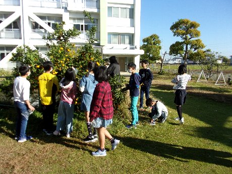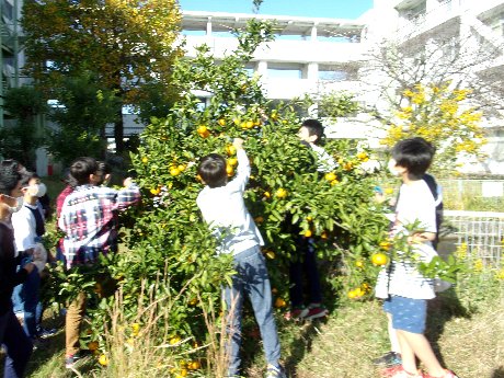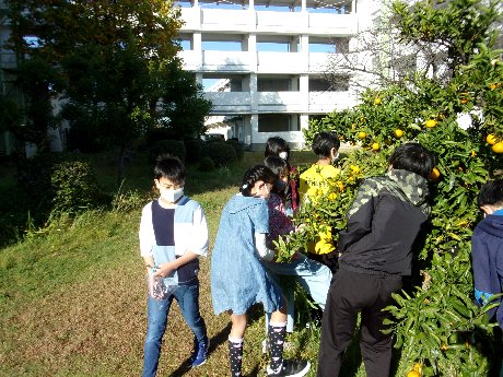 3日間で、中庭の温州みかんのみかん狩りをしました。写真は6年生のようすです。学校でみかん狩りができる学校なんて、秋竹小学校くらいのものだとおもいます。