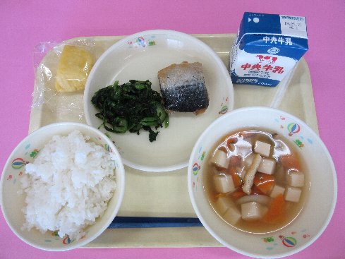 ご飯、牛乳、鯖の旨味噌煮、磯香和え、のっぺい汁、パイナップル