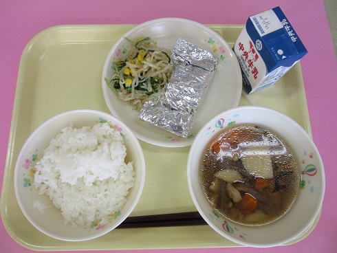 ご飯、鯖の銀紙焼き、三色和え、のっぺい汁
