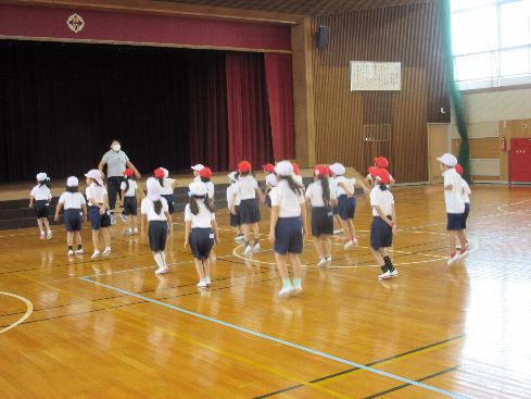 5月7日(月)今日から運動会練習が始まると言うことで、着替えに時間のかかる1・2年生は朝礼前に着替えました。朝礼の後、そのまま体育館で1・2年合同の朝の会を行いました。