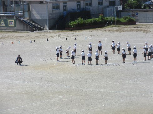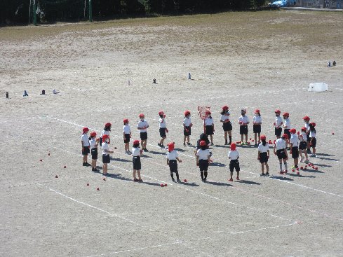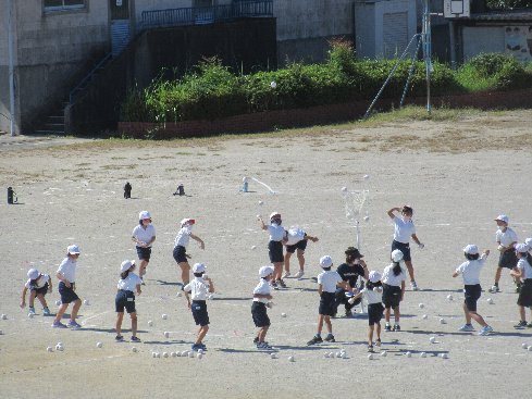 3時間目は、1・2年生合同で玉入れの練習をしました。秋竹カーニバルで実施するためです。赤白に分かれて、籠めがけて一生懸命に玉を投げていました。