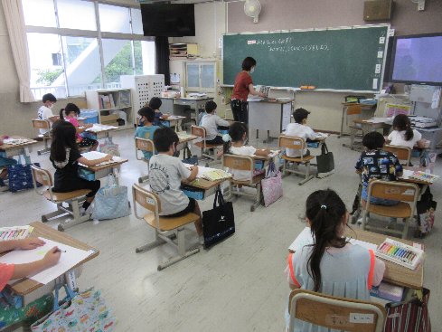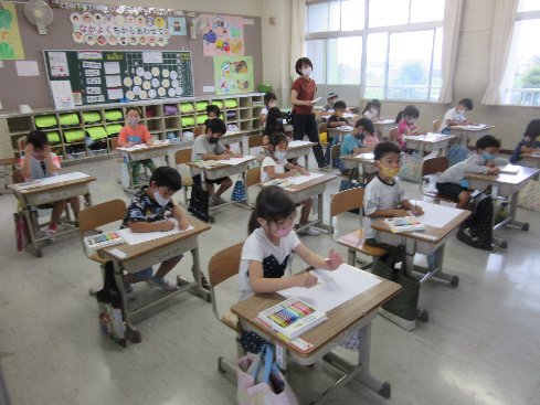 2・3時間目は図画工作の授業でした。あさがおの色水を使ってあさがおの作品作りをしました。