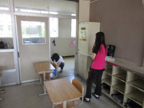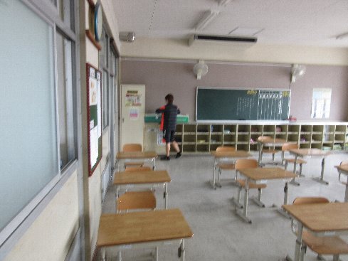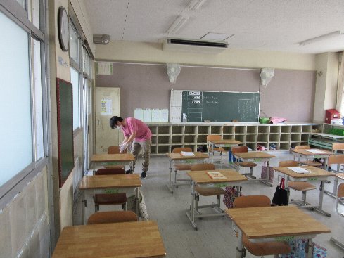 子どもたちが下校した後、先生たちで教室や廊下、トイレなど、子どもたちが生活する場所について次亜塩素酸で消毒を行っています。毎日のことで大変ですが、子どもたちの安全のため、頑張っています。