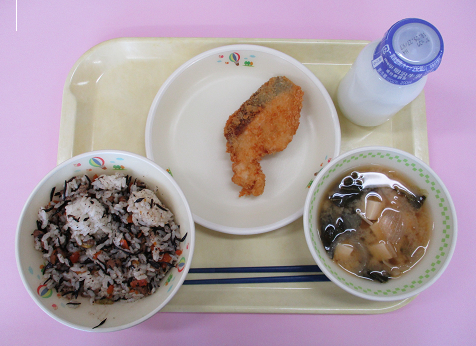 ひじきご飯、牛乳、秋鮭フライ、浅蜊のみそ汁