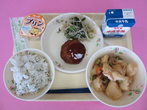 菜めし(ご飯)、牛乳、お好み半平、肉じゃが、ほうれん草の胡麻和え、プリン